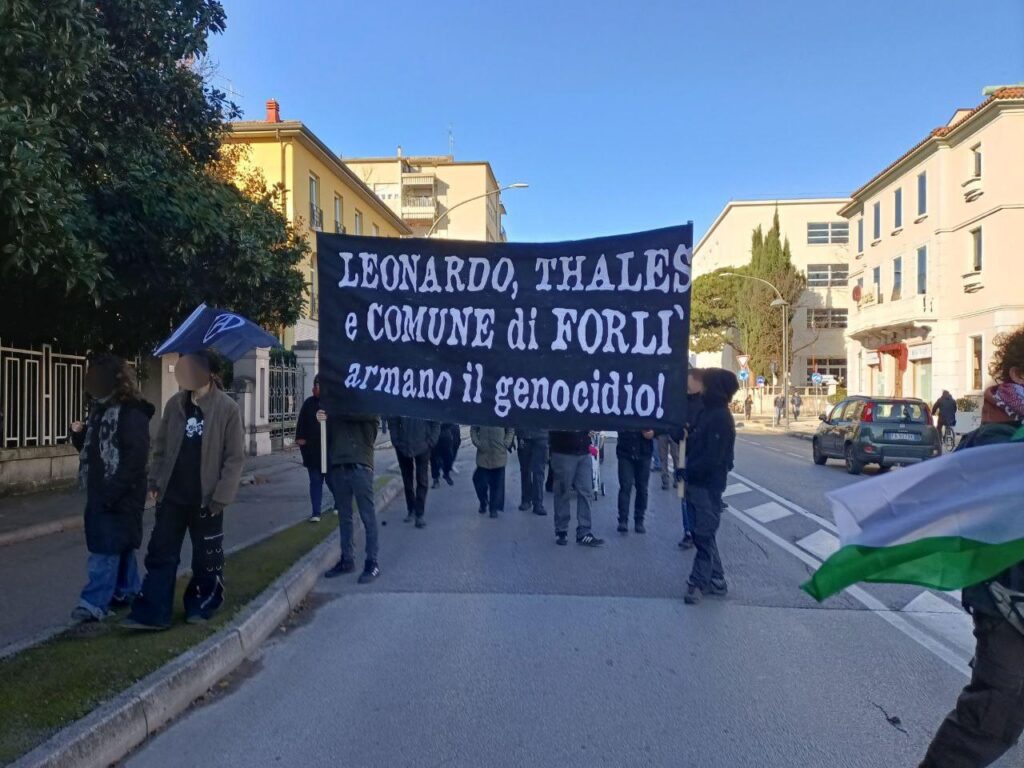 Al carnevale dell’Aeroporto al quartiere Ronco di Forlì domenica 25 gennaio una decina di persone vestite con tute con i loghi di Leonardo Spa e Thales Alenia Space hanno distribuito in centinaia di copie un volantino che riportava il seguente testo.