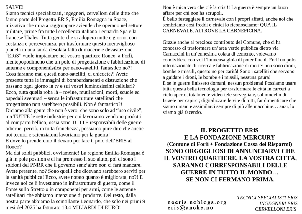 Controinformazione sul progetto Emilia-Romagna in Space (ERiS) a Forlì